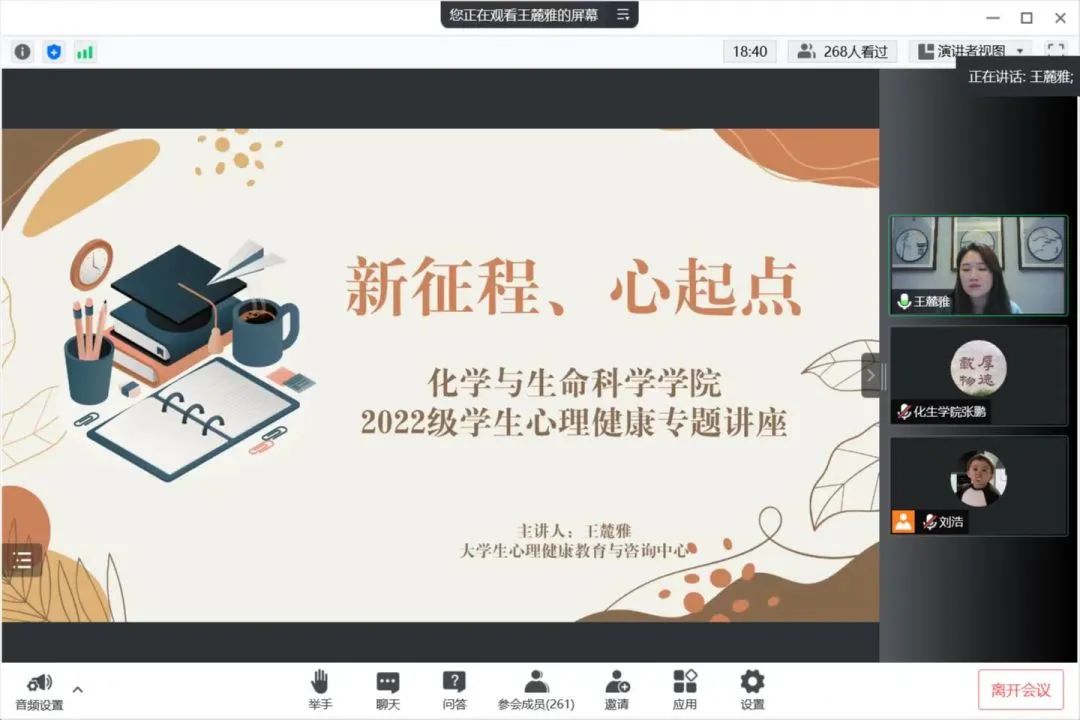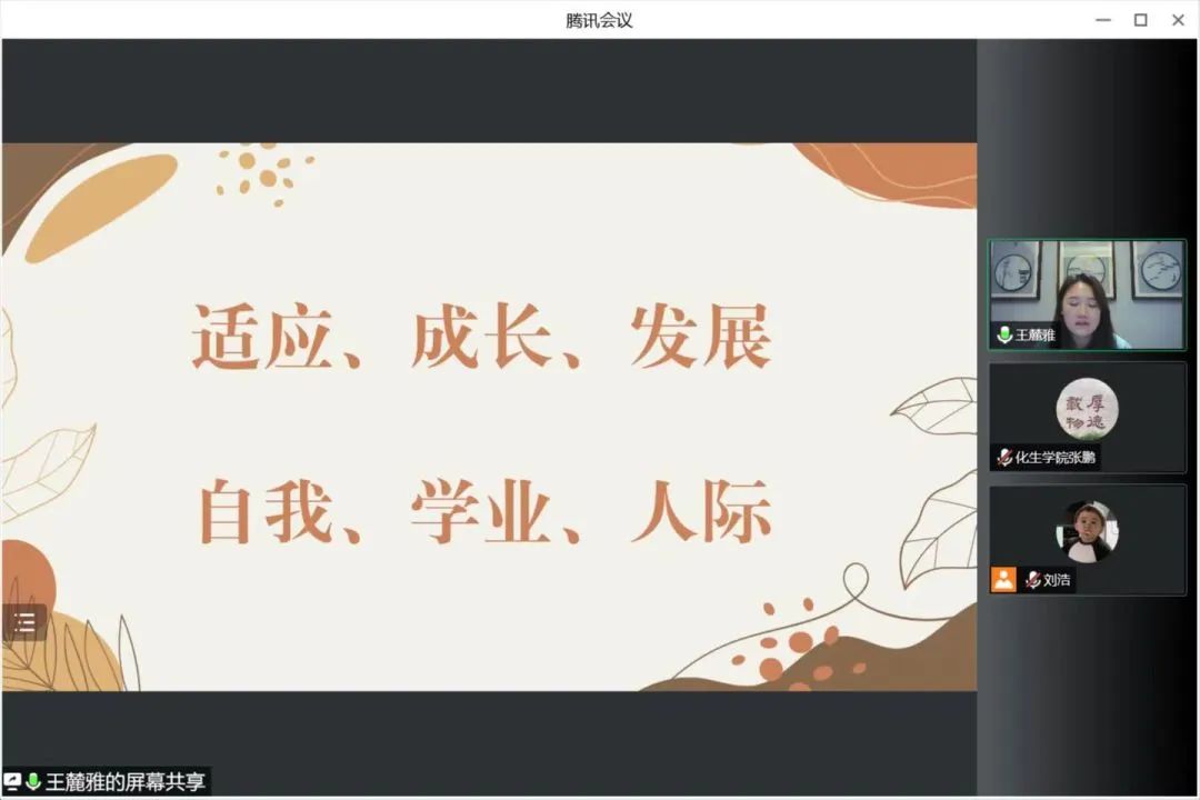 会议上,王麓雅老师主要强调四个方面内容。一是自我适应。王麓雅老师指出大一新生们正处于自我同一性形成的关键时期因此需要同学们正确认识自我,立足现实,找到自我在现实社会中最恰当的位置,充分实现自己的人生价值。二是学习适应王麓雅老师建议大一新生要尽快确立人生目标在丰富的校园文化生活中锻炼综合素质三是人际适应王麓雅老师指出大学是一个全新的生活环境,只有学会尊重,共情真诚,赞美才能建立良好的人际关系。最后王老师表示如果新生有任何问题都可以进行心理咨询,并且鼓励新生放平心态稳扎稳打用心钻研,勇攀高峰