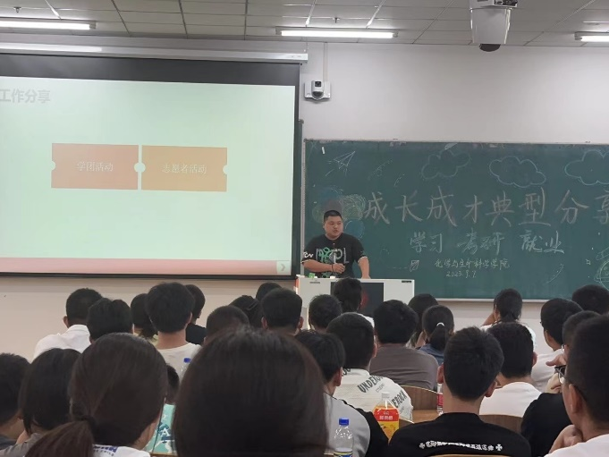 在大学期间荣获各种竞赛课题奖项的刘浩学长向大家展示了自己的科研成果,同时他也是“全寝7人全部保研”的主人公之一,他向学弟学妹们介绍了在大学中积极参加各类竞赛的重要性,讲述了自己的心路历程,他告诉大一新生要有“咬定青山不放松”的韧劲”和“不破楼兰终不还”的执着气息,定会取得自己理想成绩!