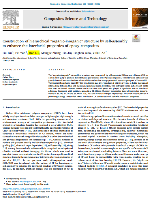 “天道酬勤”是沉淀在科技工作者基因血脉里的朴素信仰。在一个个平凡的日出日落间,一幕幕平常的实验场景中,大家都能看到刘浩同志的身影。作为一名理工类专业学生,她怀揣科技报国的理想追求。科研方面,在老师的指导下,该同志在本科期间就积极参与教师课题组科研项目,参与省级科创项目两项,以合著者身份在国际复合材料领域顶级期刊《Composites Science and Technology》(IF:9.1)上发表Construction of hierarchical “organic-inorganic” structure by self-assembly to enhance the interfacial properties of epoxy composites论文;在《Composites Part-B》(IF:13.1)上发表Water-based PEKC-COOH sizing agent for enhancing the interfacial adhesion of carbon fiber/polyether-ether-ketone composites论文。以项目负责人身份完成2021年度国产视频