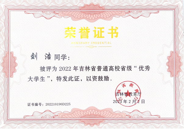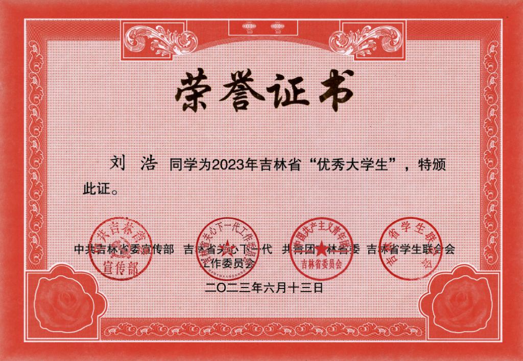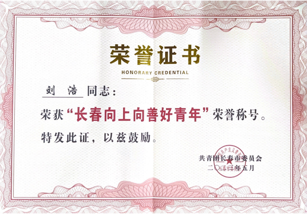 优秀志愿者标兵称号。2022年,新冠疫情席卷吉林,作为学生党员、学生干部,他始终坚守共产党员的初心与使命,毅然承担起了学院志愿者工作负责人及寝室楼宇负责人等工作。