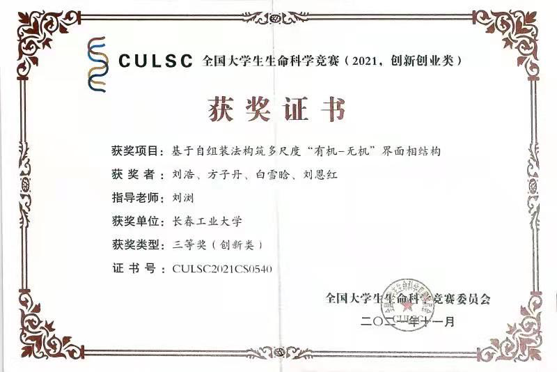 化学专业2023级硕士研究生,学院230801班班长。学院第十九届学生会秘书长、生活部部长。吉林省优秀大学生(实践专项),吉林省高校省级优秀大学生,吉林省大学生自强之星,长春市向上向善好青年。在校期间多次以项目负责人身份参加挑战杯全国大学生课外学术科技作品竞赛、全国生命科学竞赛、互联网等科创竞赛,累计荣获国家级奖项6项、省级奖项6项。在国际复合材料领域著名期刊发表论文3篇,申请国家发明专利5项。在校期间多次投身新冠疫情防控志愿服务,荣获国产视频