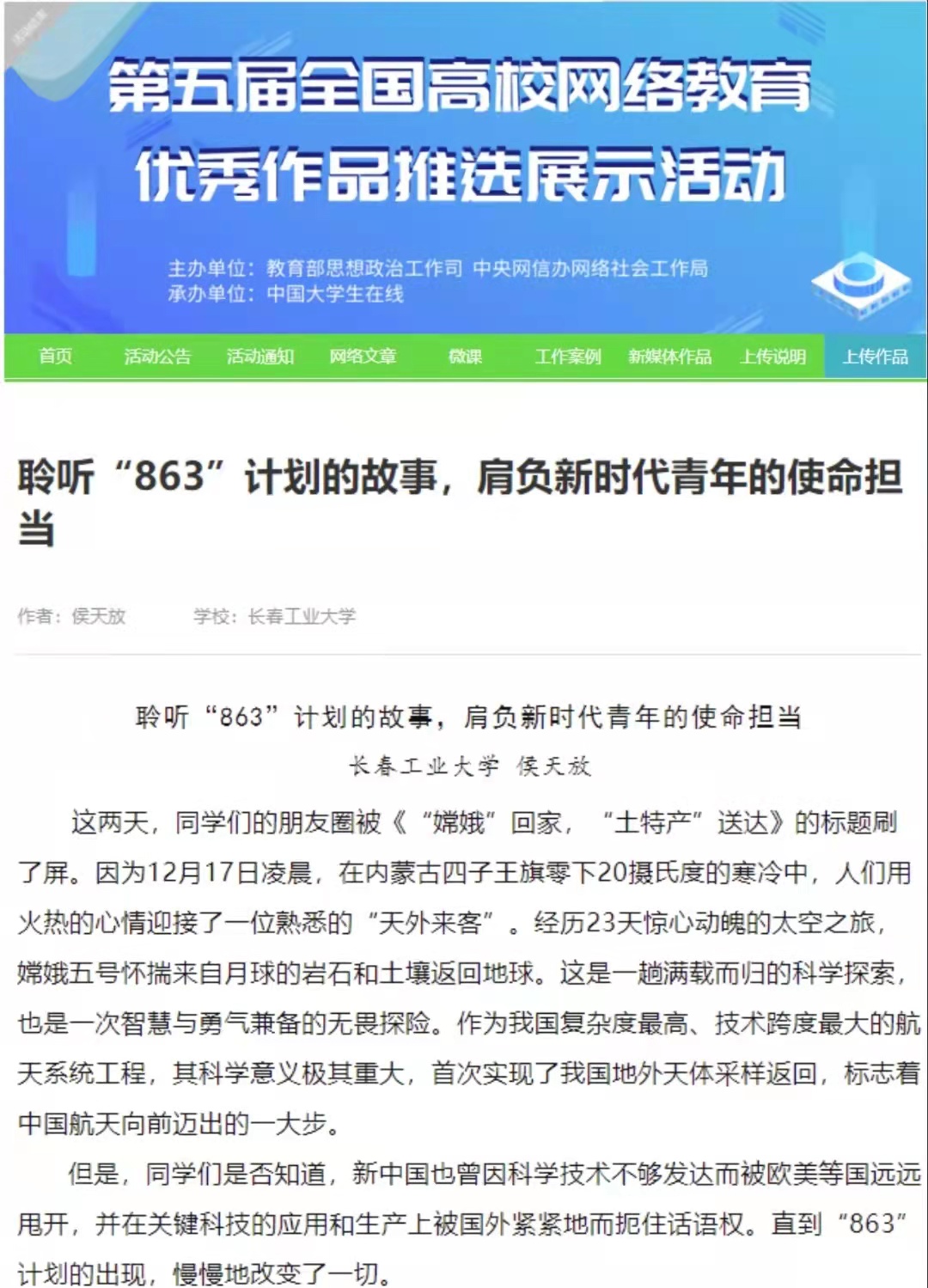网络文章类获奖作品《聆听“863”计划的故事,肩负新时代青年的使命担当》、微课类获奖作品《新时代中国青年的责任与担当》分别在国内最大、面向全国大学生开展思政工作的主题教育网站“中国大学生在线”上进行专题展示。