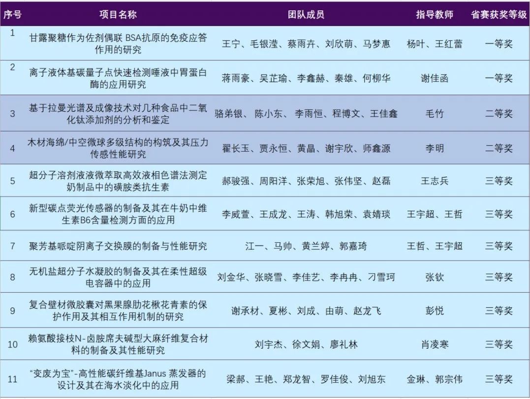 子的良好形象和综合素质,并在大赛中荣获一等奖2项,省级二等奖2项。其中,由杨叶、王红蕾老师指导的甘露聚糖作为佐剂偶联BSA抗原的免疫应答作用的研究、谢佳涵老师指导的离子液体基碳量子点快速检测唾液中胃蛋白酶的应用研究,在众多团队中脱颖而出,入围即将在宁波举行的全国总决赛。