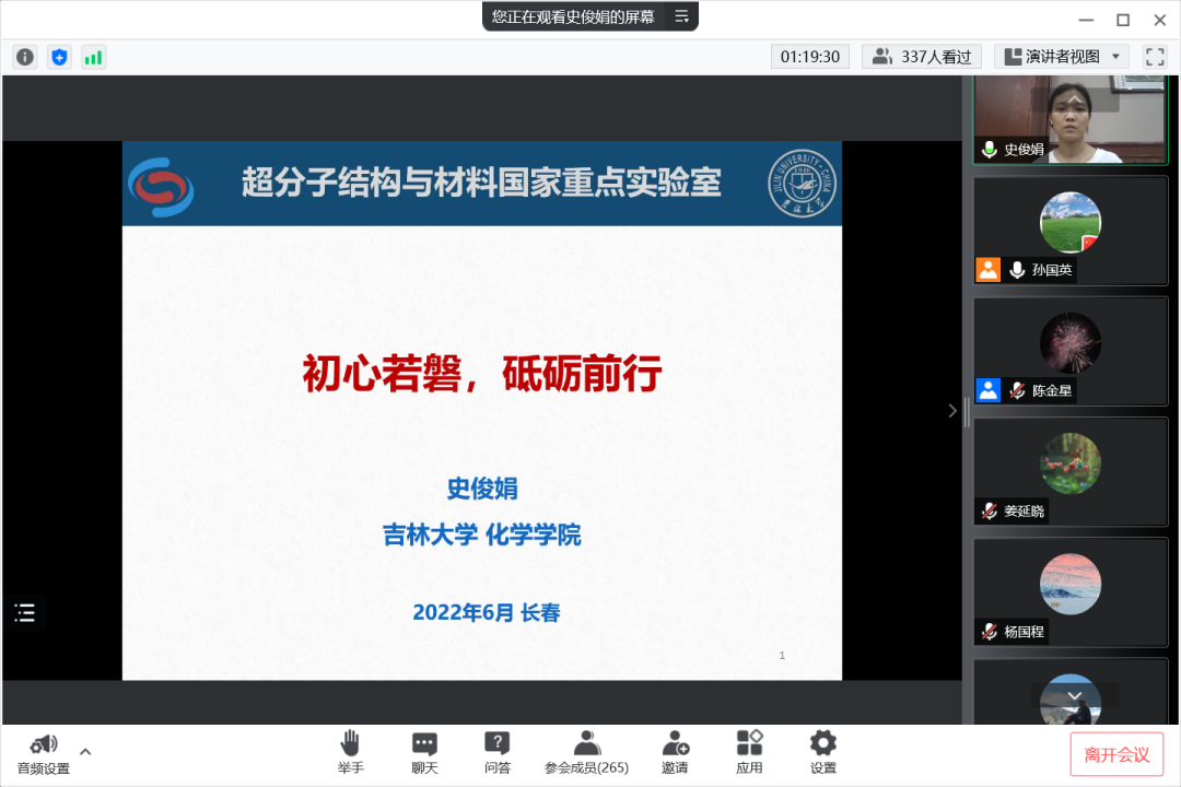 会上,姜延晓,王显,史俊娟,陈金星四位优秀毕业生分别以“向优秀之人看齐做更好自己”、“质子交换膜燃料电池:从催化剂到器件性能表达”、“初心如磐,砥砺前行”、“在长春的十年——从工大到应化所”为主题向同学们详细介绍了个人的学术研究方向,研究领域,个人就业经验以及课题组具体情况,讲述了自身考研复试的经历和经验,追忆在工大四年的宝贵时光,表达了对母校和老师的感谢和对老师同学的美好祝愿,并对同学们提出的有关考研和出国留学流程等问题进行了详细解答。最后,孙国英副院长进行总结,她鼓励同学们向优秀学生看齐,注重培养自身的科研兴趣和辩证思维能力,努力实现自我的人生价值。