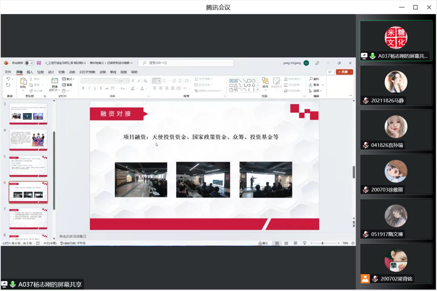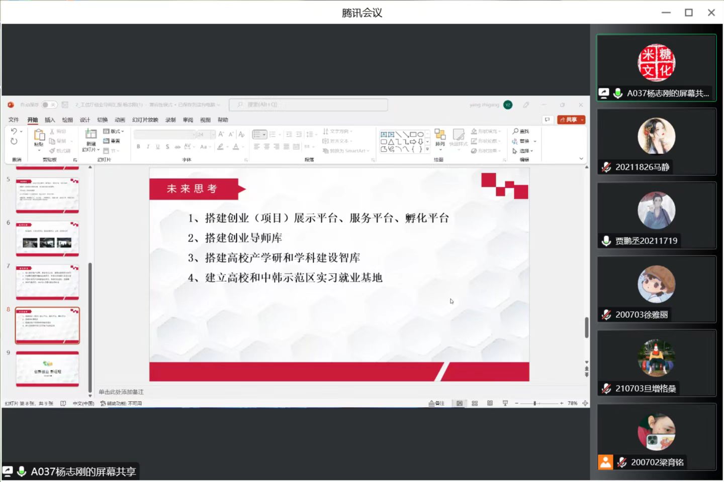 本次会议中,杨志刚老师主要强调四个方面内容。一是创业辅导。杨志刚老师对高校进行创新创业教育的背景、目的和意义进行了解读,从创业就业集训营,路演,科技周、双创周活动和人才对接会详细介绍了创新创业的方法途径。二是融资对接。杨志刚老师详细介绍了天使投资资金,国家政策资金等项目融资,为学生在创新创业过程中的资金问题提供了帮助。三是辅导案例。杨志刚老师介绍了靖宇蓝莓产业园等项目,给学生创业带来了启迪。四是未来思考。杨志刚老师从搭建创业,搭建创业导师库,搭建高校产学研和学科建设智库等方面引发同学们对未来的思考,并且建议同学们脚踏实地、勇于探索、大胆创新。为自己未来的就业做好充分的准备,以便实现个人更快、更好的发展。