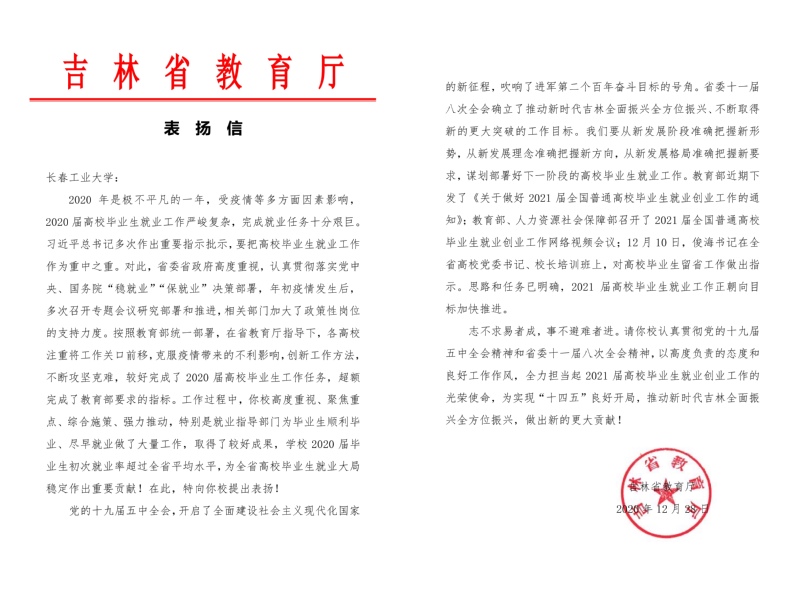 新闻网讯(通讯员 田兵)近日,学校收到吉林省教育厅表扬信,对学校征兵工作提出表扬。信中指出:2020 年征兵工作启动以来,国产视频