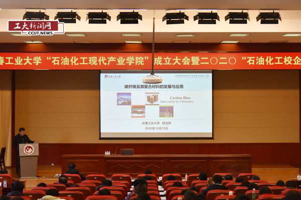 新闻网讯(通讯员 孙树林)12月18日学校“石油化工现代产业学院”成立大会暨二零二零“石油化工校企论坛”在南湖校区学术报告厅举行。吉林省教育厅高教处处长宋辉,校长张会轩,副校长李占国出席会议,成立大会由副校长张明耀主持。吉林大学、中科院长春应用化学研究所、中国石油吉林石化公司研究院、吉林石化公司合成树脂厂、辽阳石化公司、大庆石化公司、中国中车长春轨道客车股份有限公司、吉林碳谷碳纤维股份有限公司、吉林精功碳纤维有限公司、吉林国兴复合材料有限公司、中国兵器北方华锦集团有限公司、天津利安隆新材料股份有限公司、双辽昊华化工有限公司、吉林省开顺新材料有限公司、长春吉原生物科技有限公司、吉林华邦新材料科技有限公司、吉林省龙展新材料科技有限公司、吉林中科金盛科技有限公司、吉林伊特胶管有限公司等二十二位专家学者代表出席本次会议。