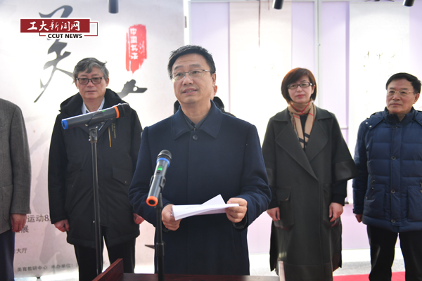 李占国在致辞中指出,2020年是不平凡的一年,值此一二·九运动85周年之际,学校举办书法作品展,既是铭记历史、砥砺当代的思想教育,又是陶冶高尚情操、塑造美好心灵、提升艺术素养和人文素养的审美教育。希望以此次书法展为契机,以习近平总书记“全面加强和改进学校美育,坚持以美育人、以文化人,提高学生审美和人文素养”的重要指示精神为指导,以立德树人为根本,积极探索学校美育工作新理念、新方法,全面深化学校美育综合改革,整合美育资源、建构体制机制、完善课程设置、强化实践体验、搭建特色平台,激发学校美育教育的活力。要始终坚持全员育人、全过程育人、全方位育人,形成充满活力、多方协作、开放高效的学校美育新格局,为培养德智体美劳全面发展的社会主义建设者和接班人而不懈努力。