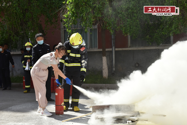 师生在消防队员指导下学习消防器材使用