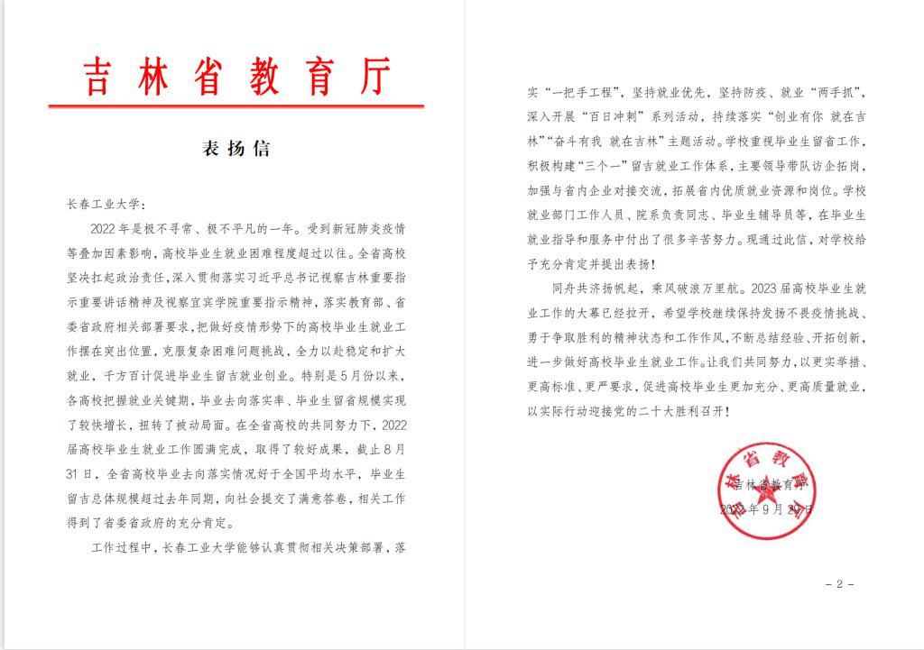 学校2022届毕业生就业工作获吉林省教育厅表扬